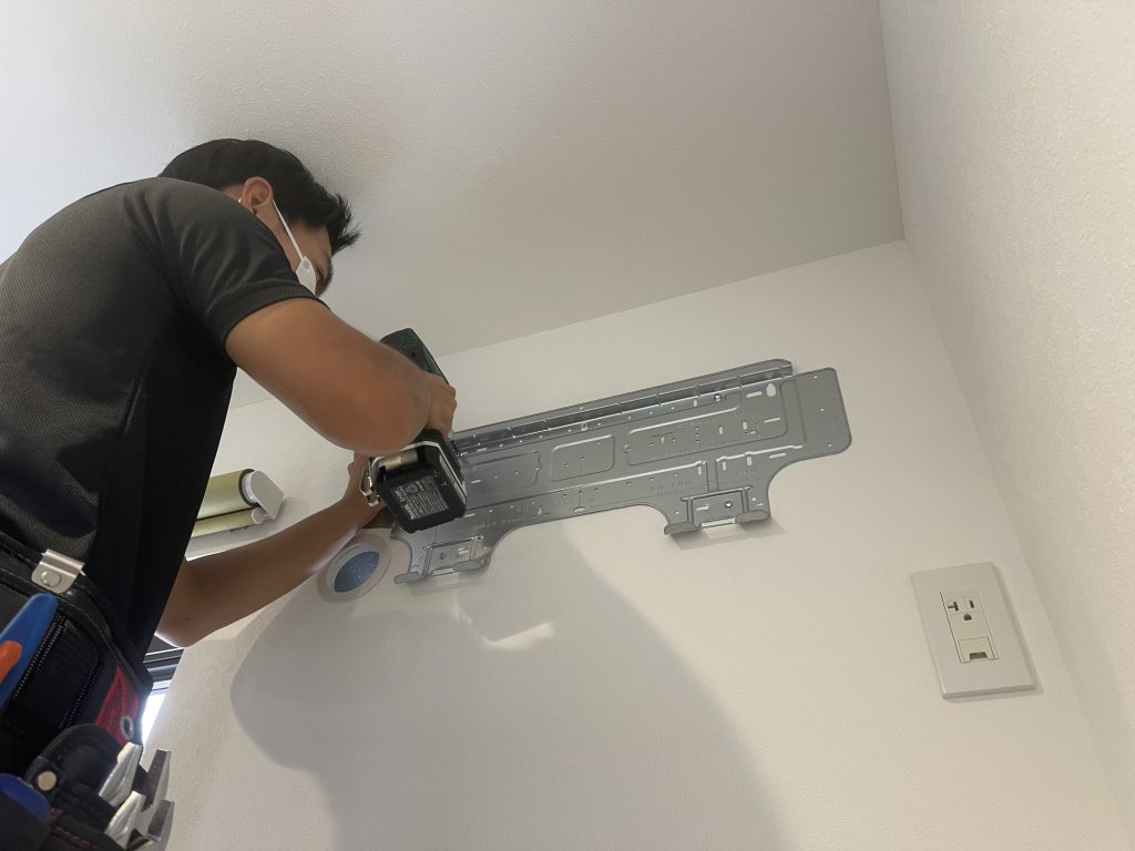室内機を取付けるために据付板という金属板を壁に固定します。